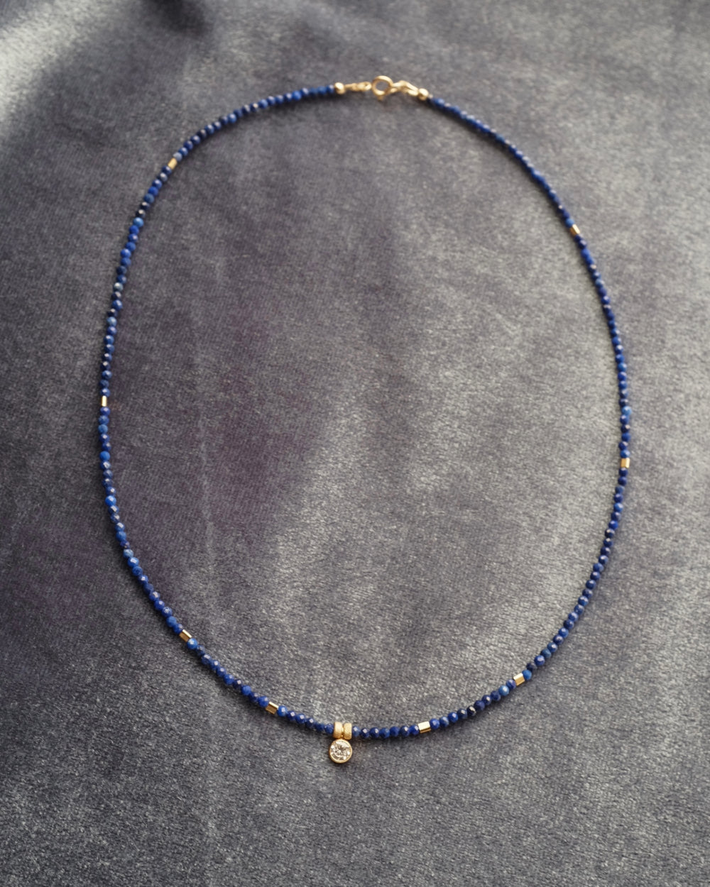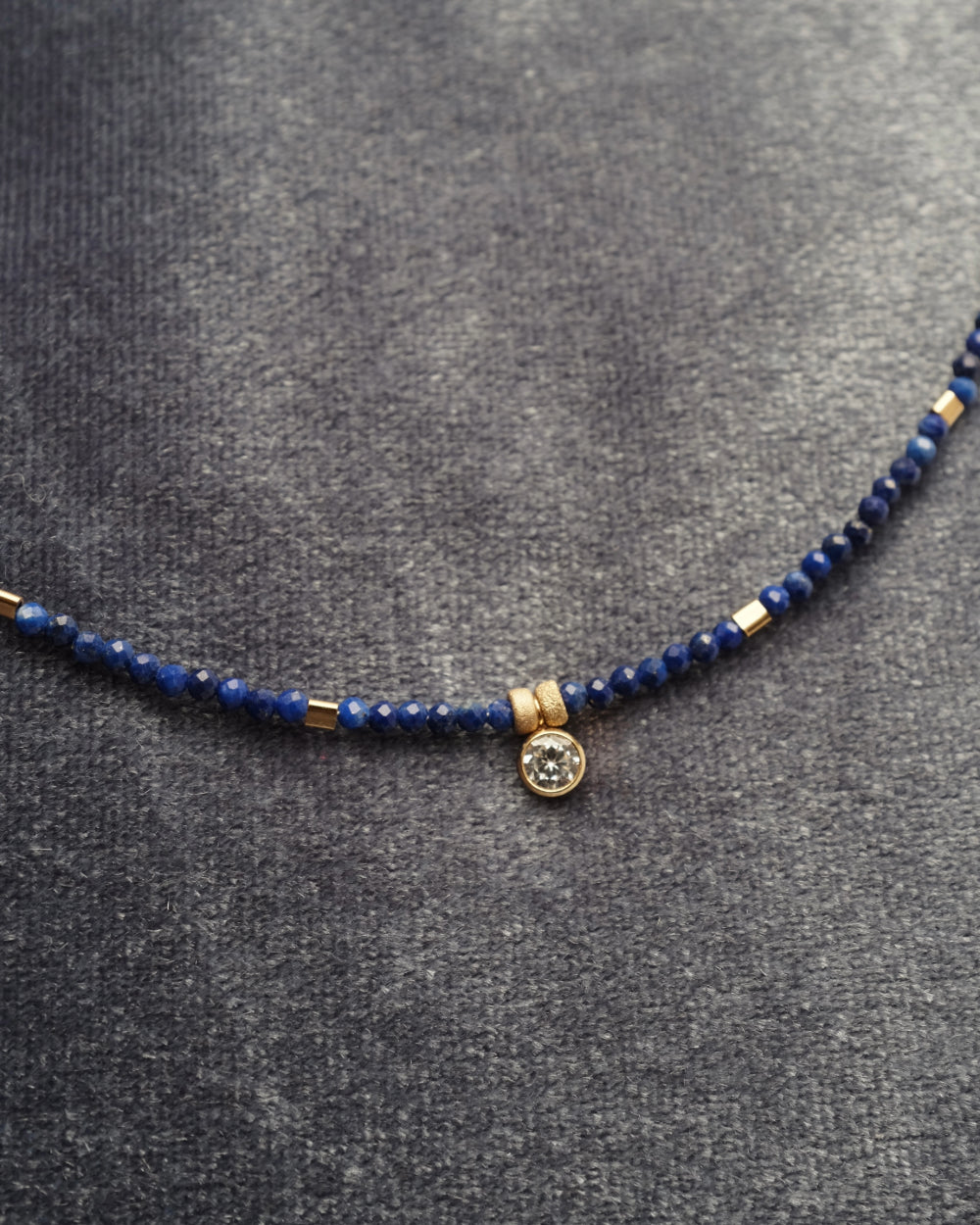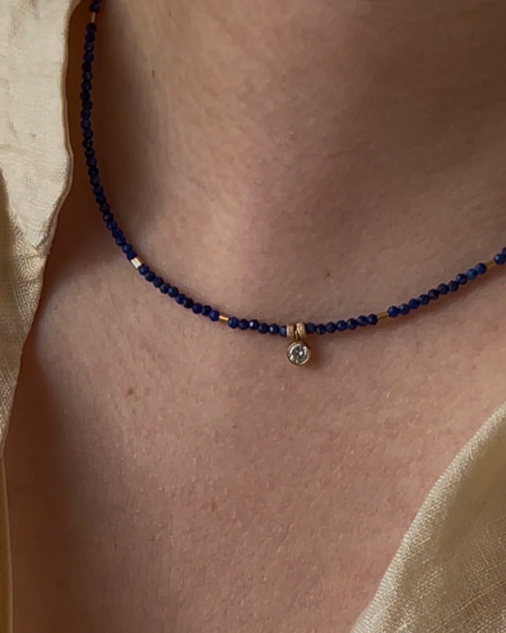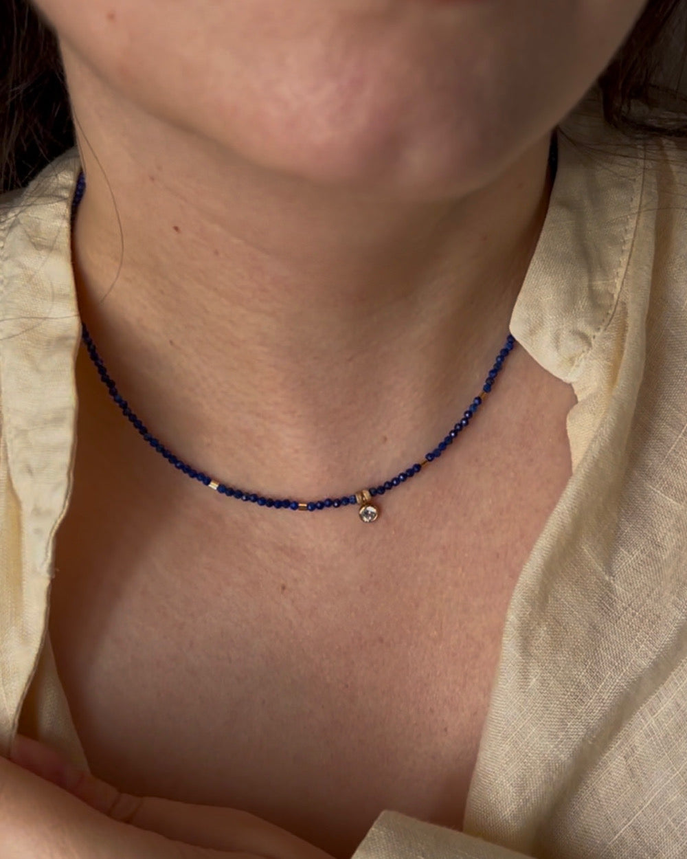 Un colier elegant și plin de semnificație, realizat manual cu multă grijă și atenție la detalii. Fiecare piesă îmbină frumusețea naturală a pietrelor Lapis Lazuli cu strălucirea caldă a accentelelor Gold Filled placate cu aur de 14K.