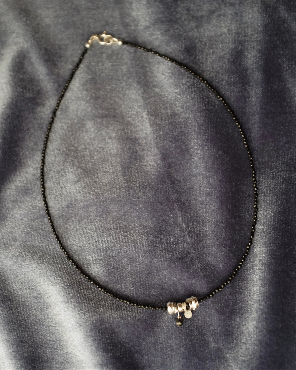 Un colier elegant și versatil, realizat manual cu multă grijă și atenție la detalii, care îmbină profunzimea spinelului negru cu rafinamentul argintului 925.