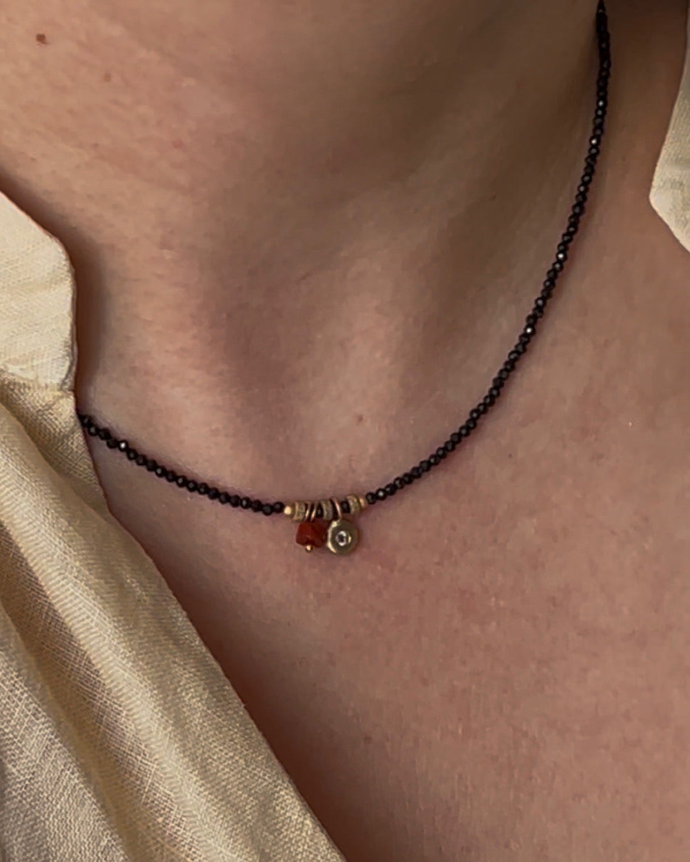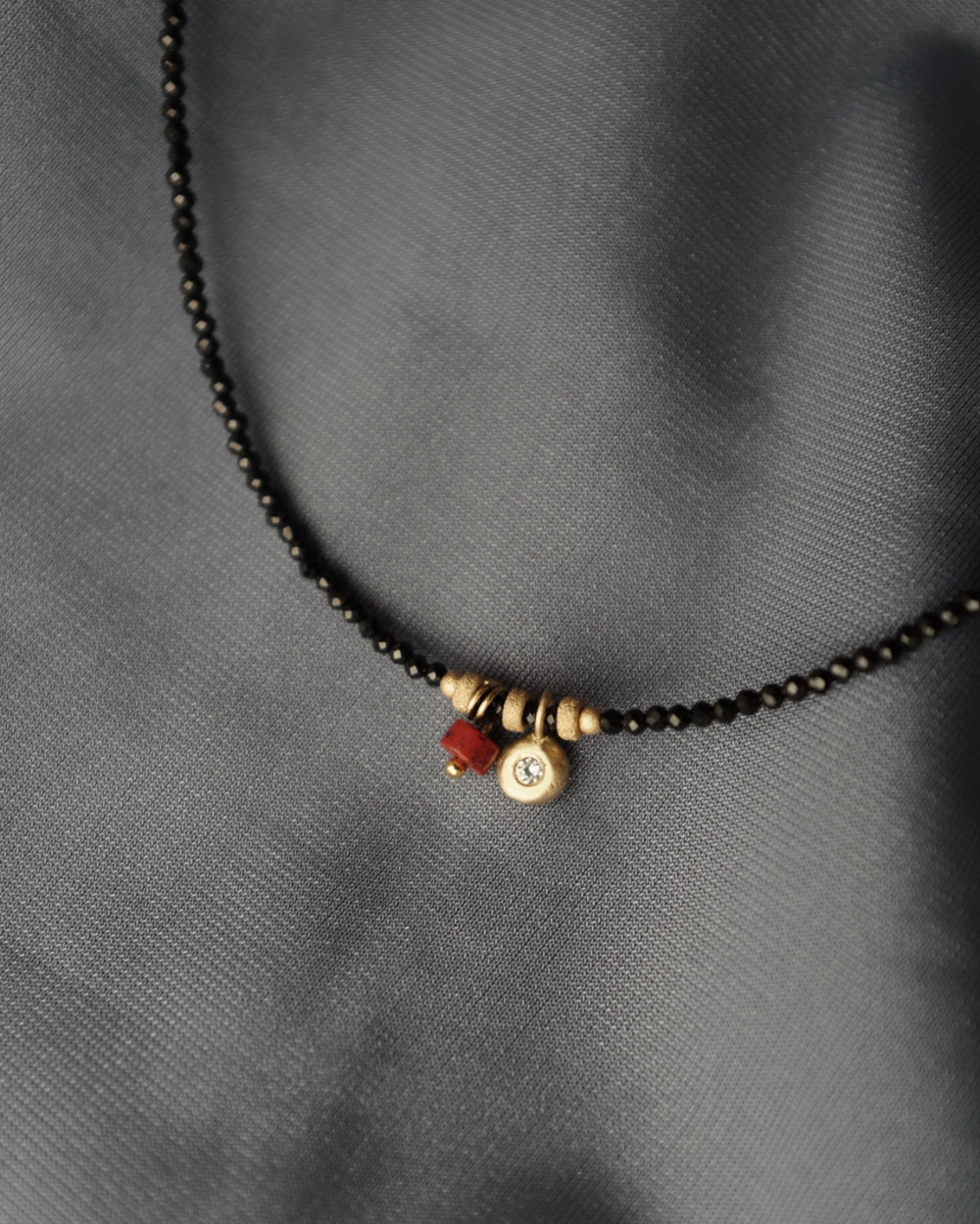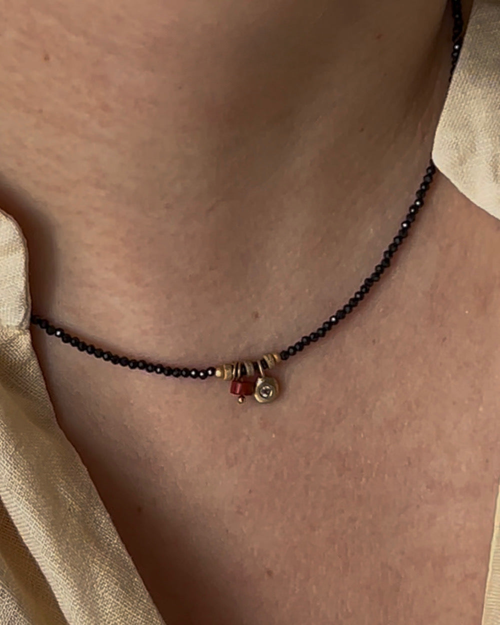 Un colier sofisticat, realizat manual cu multă grijă, care îmbină energia protectoare a spinelului negru cu eleganța aurului și delicatețea pietrelor semiprețioase.
