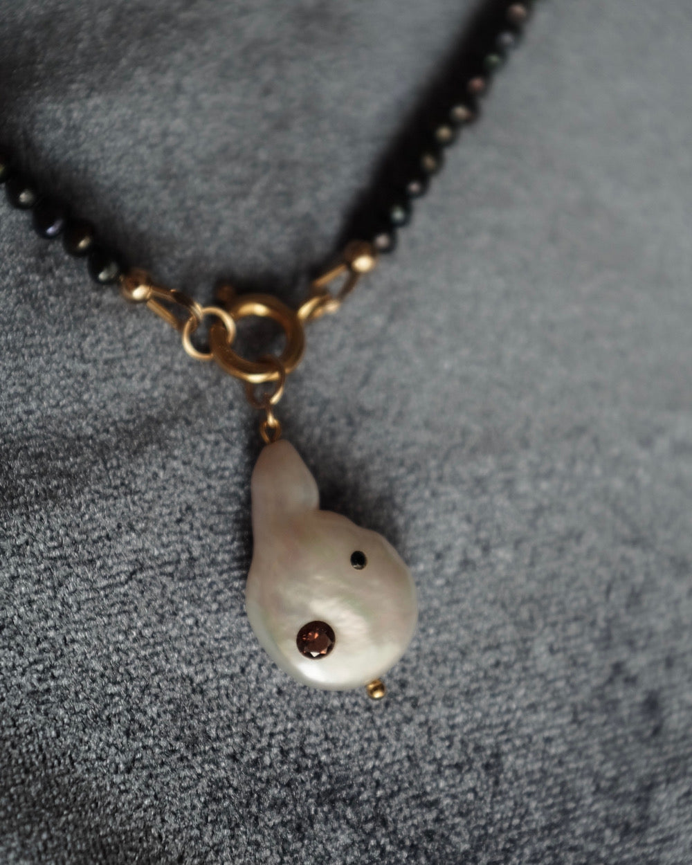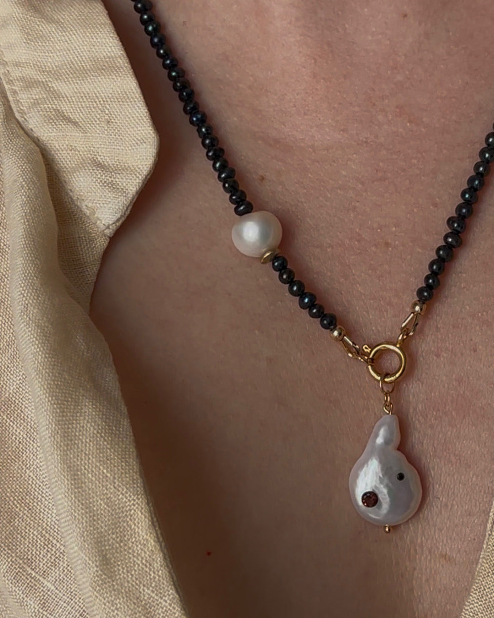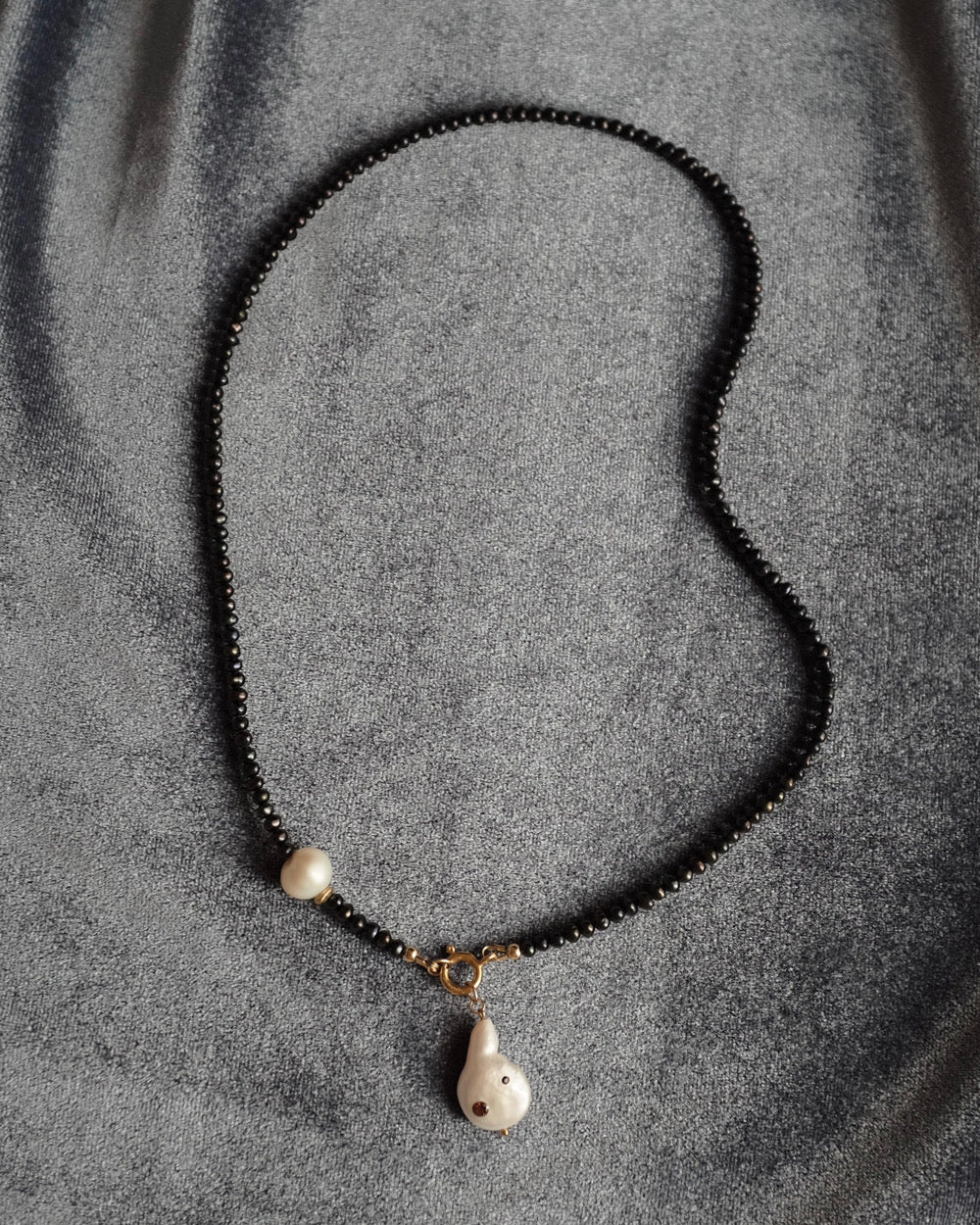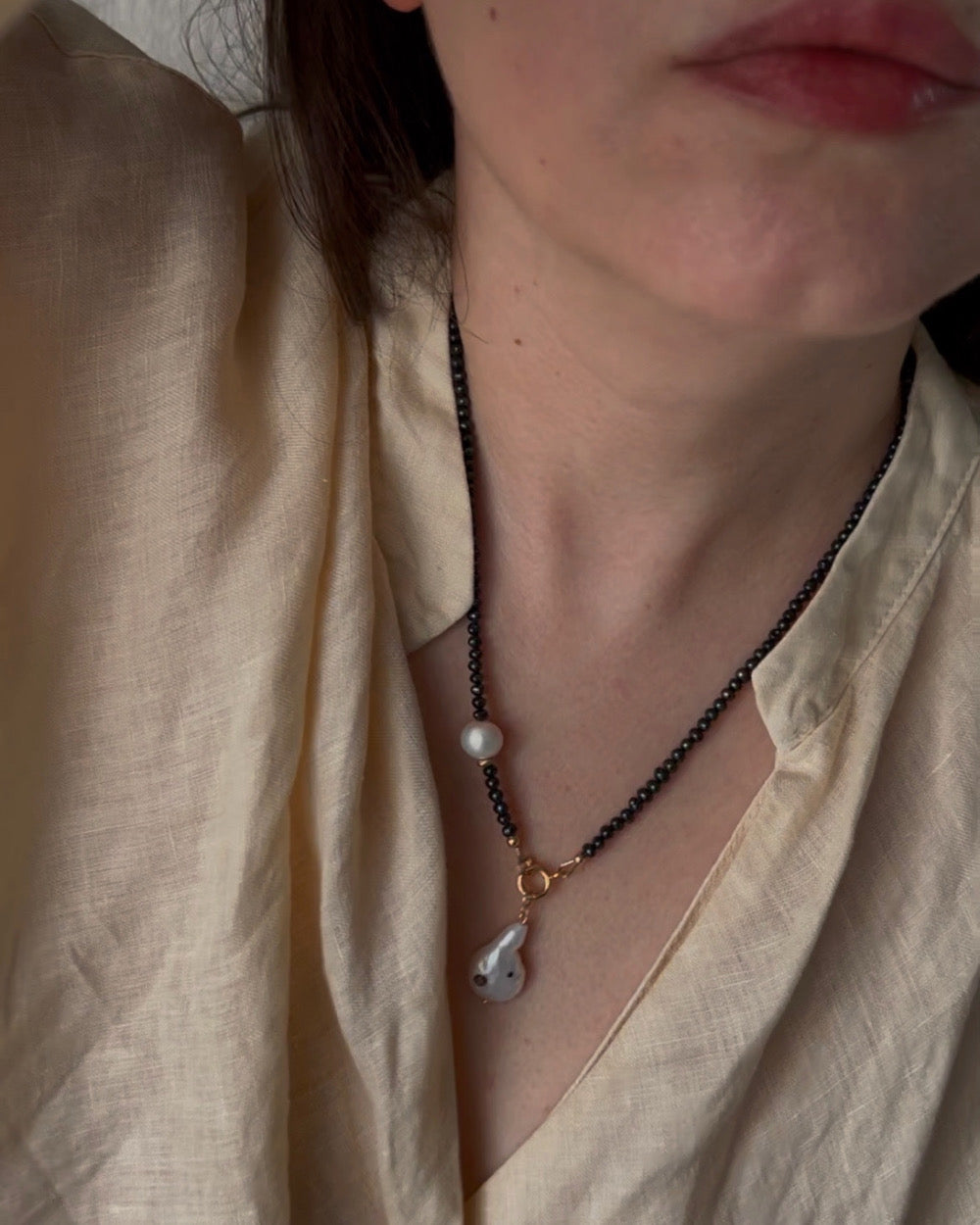 Colierul este realizat din perle naturale de cultură negre, fiecare diferită prin formă și luciu, ceea ce conferă bijuteriei un caracter autentic și organic. Perla albă centrală, folosită ca pandantiv, poartă două pietre cubic zirconia (CZ) fin montate in propriul atelier, ce adaugă o strălucire subtilă.
