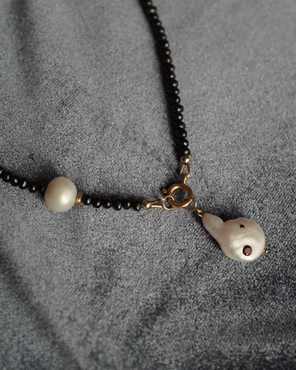 Un colier cu personalitate, creat manual cu multă grijă, care combină contrastul dintre lumina perlelor albe și profunzimea celor negre într-o piesă unică, plină de expresivitate.